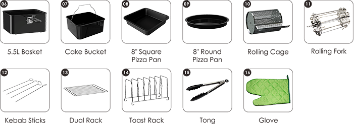 - 5.5L food basket with FDA &LFGB approved non-stick coating.